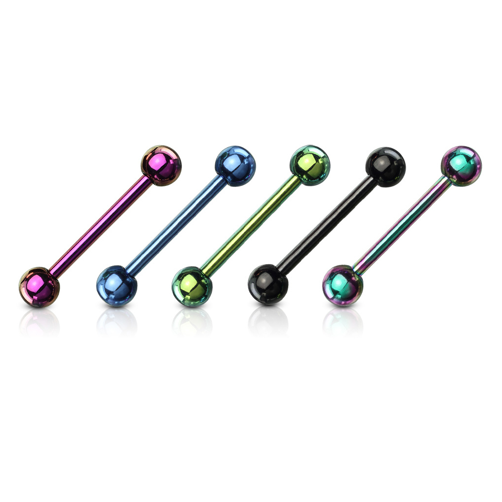 Se está a procura de algo novo para o seu piercing da língua, e não quer comprometer a qualidade das suas joia, este conjunto é algo para si. Com este conjunto conseguirá cinco joias de alta qualidade para o seu piercing da língua, todas elas banhadas a titânio sobre aço cirúrgico. Cada uma destas joias tem uma cor distinta, e uma delas é multicor.