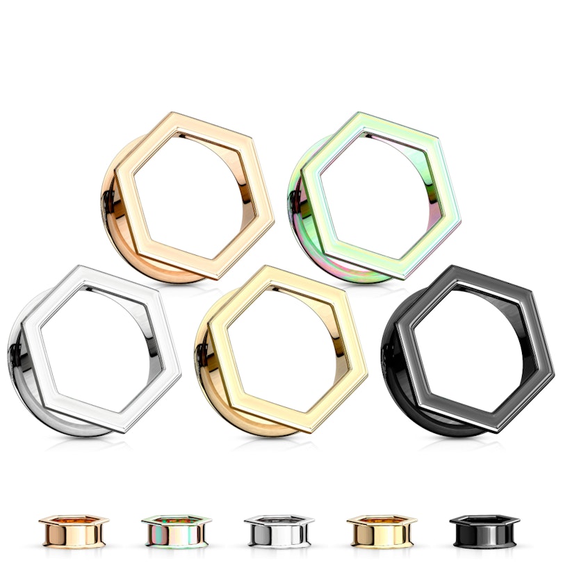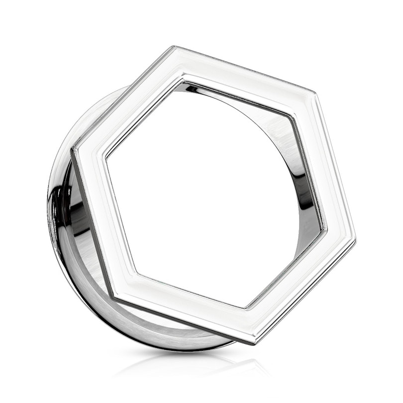 Esta joia original de aço cirúrgico apresenta um desenho hexagonal na sua parte superior, além de uma elevação na parte traseira. Ao estar elevada nas extremidades, o túnel tem um perfeito encaixe. Estas elevações fazem com que seja desnecessário que venha com roscas.