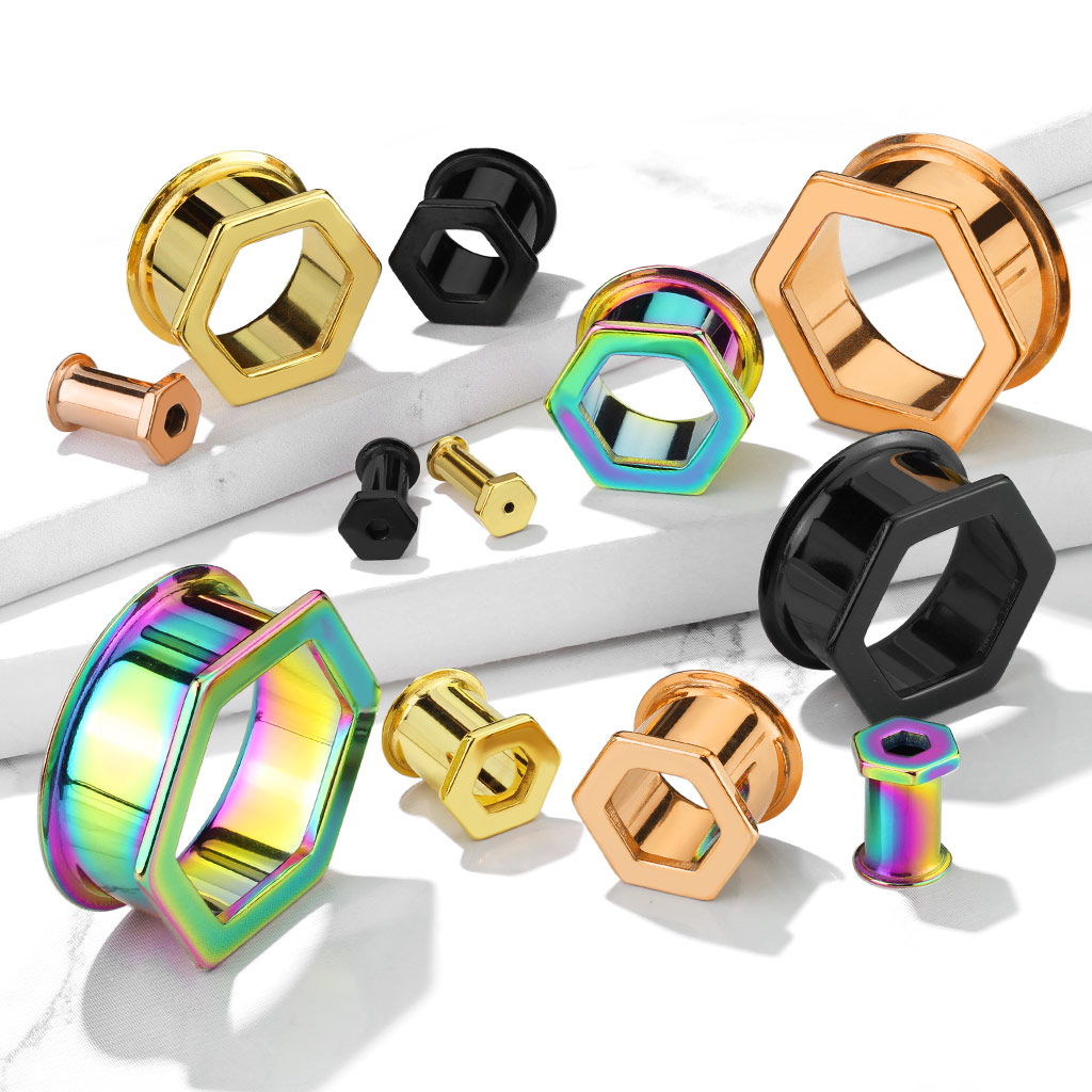 Nome: Alargador com forma hexagonal em cinco cores diferentes