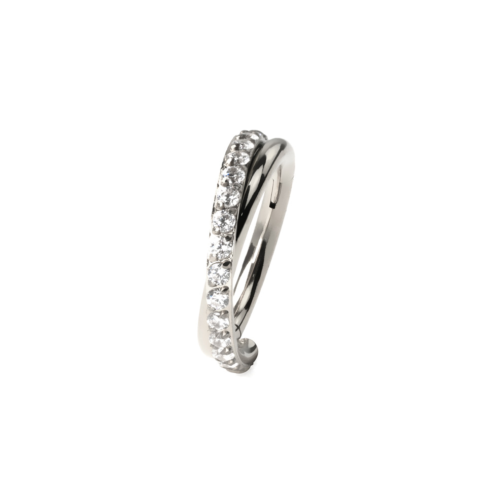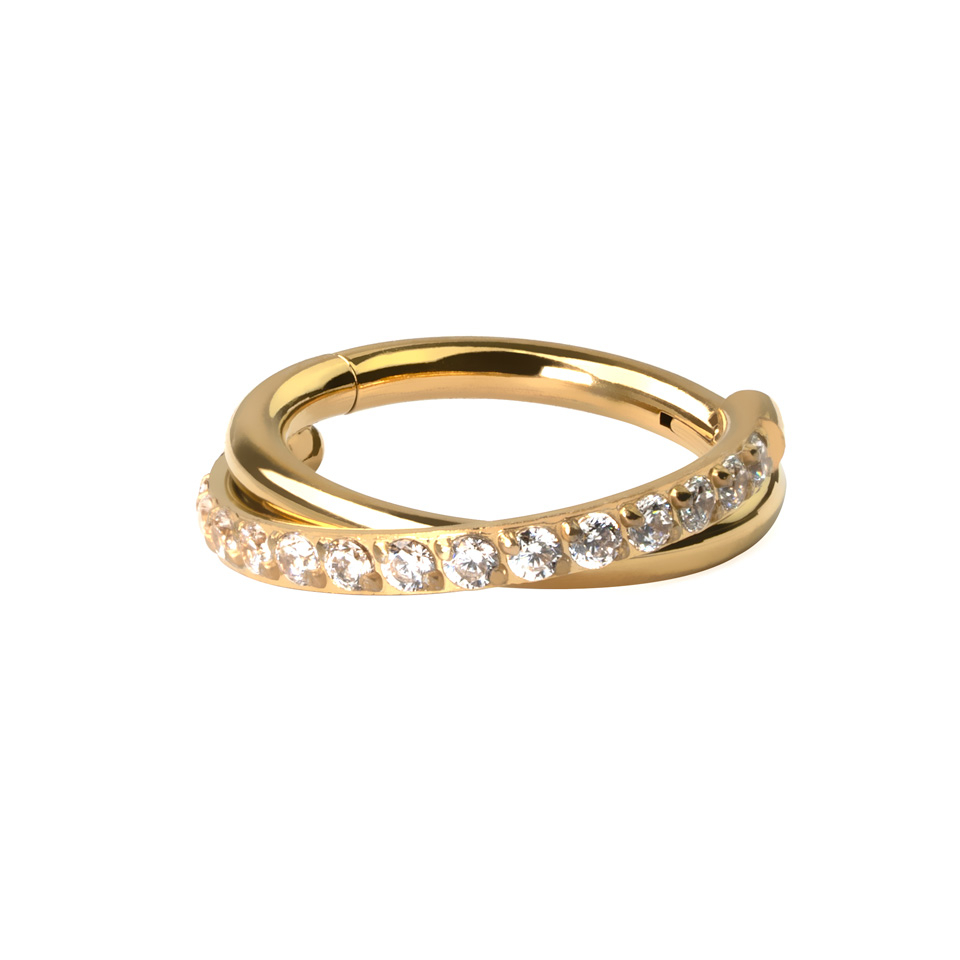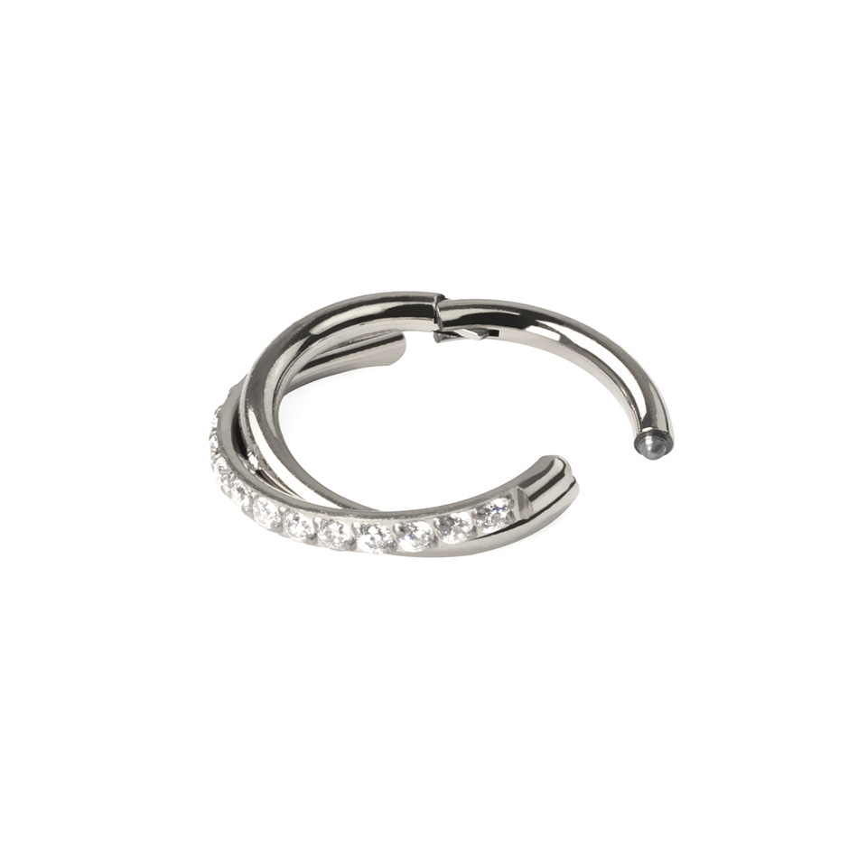 Esta argola incrível é tão bonita, como prática. O sistema articulado torna a sua colocação muito mais rápida e fácil: para abrires a argola, basta puxar o segmento para cima, inseri-la no teu piercing e pressionar novamente para baixo, até ouvires um clique, fechando-a. O pormenor do arco, que cruza com a argola principal, é perfeito para dar um toque de brilho aos teus piercings na orelha, como, por exemplo, o helix, o daith, o rook e os que são feitos no lóbulo.