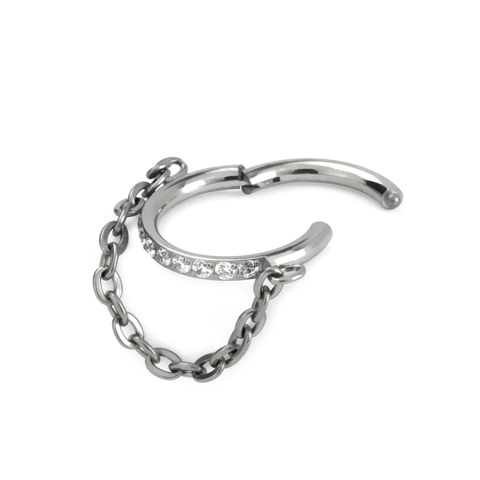 Argola articulada em titânio com uma fileira de pedras delicada e um detalhe com correntes. A corrente está presa aos dois lados, mais ou menos a meio, para ficar pendente no fundo da argola.