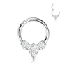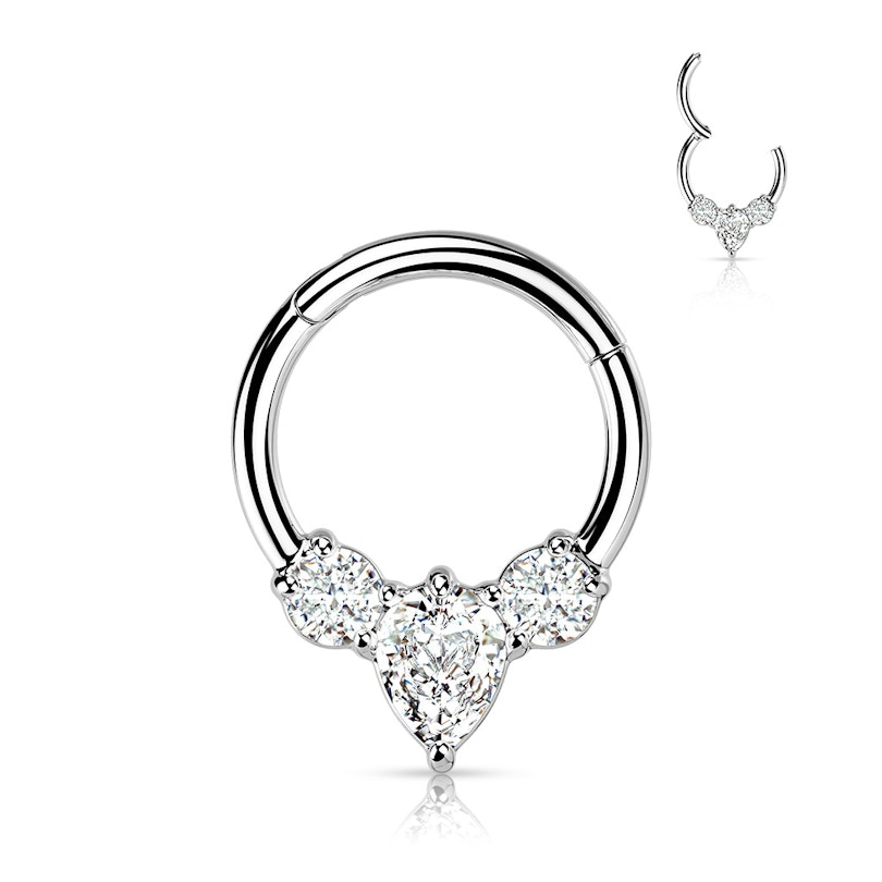 Esta argola de aço cirúrgico maciço é a solução para dares brilho ao teu piercing. A joia recebe um revestimento a PVD, que é muito duradouro, de modo a oferecer várias opções de cores, que não resistiriam igualmente ao tempo se fossem produto de um revestimento normal. A argola tem um design ostentoso, conseguido através de três pedras: uma no centro, com a forma de um losango, e duas redondas que a acompanham de cada lado. Estas pedras brilhantes estão viradas para a frente, tornando esta argola perfeita para o piercing no septo e para alguns piercings na orelha, como o daith ou o tragus.