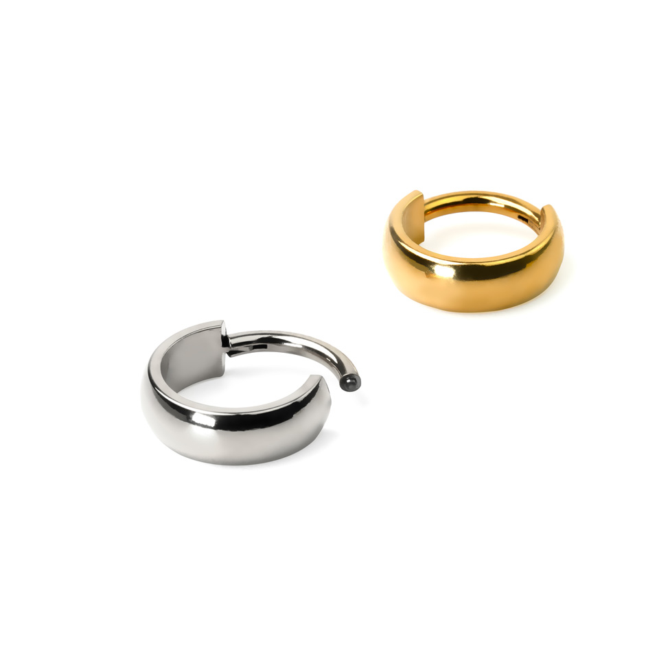 Esta argola articulada de titânio tem um arco largo virado para fora que a torna numa verdadeira joia que se demarca. Está disponível em 4 cores: prateado, preto, dourado e dourado com tons de rosa.