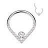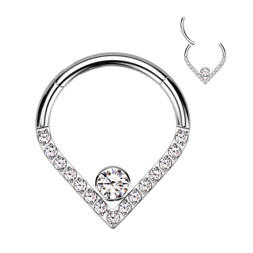 Esta argola de titânio e articulada contém várias pedras pequenas e uma pedra grande, que forma um vértice.