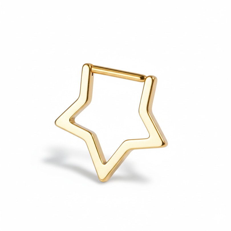 Esta argola articulada de titânio em forma de estrela é a joia ideal para colocar em vários piercings. Este é o tipo de joia que ficaria muito bem em piercings como o septo, o helix, o lóbulo ou o rook. É feita de titânio, resistente à água, suave para a pele e feita para durar. A articulação facilita a introdução no piercing. Na verdade, esta joia é oca por dentro, por isso, ficas com um artigo mais robusto, mas muito leve e confortável.