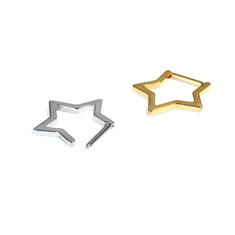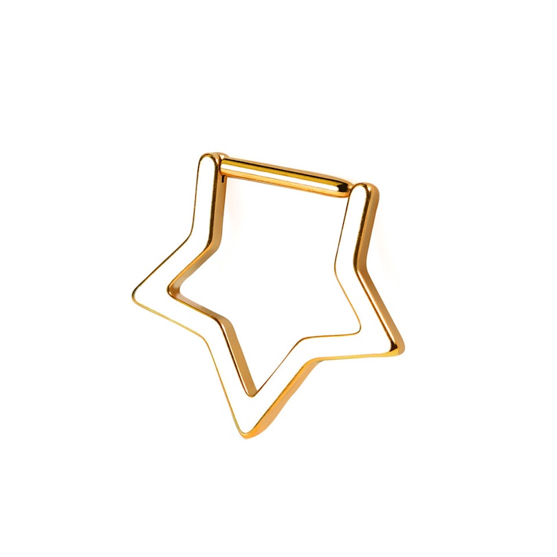 Esta argola articulada de titânio em forma de estrela é a joia ideal para colocar em vários piercings. Este é o tipo de joia que ficaria muito bem em piercings como o septo, o helix, o lóbulo ou o rook. É feita de titânio, resistente à água, suave para a pele e feita para durar. A articulação facilita a introdução no piercing. Na verdade, esta joia é oca por dentro, por isso, ficas com um artigo mais robusto, mas muito leve e confortável.