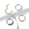 A argola está disponível em quatro cores, graças ao revestimento PVD, que tem muita durabilidade e que tem a flexibilidade de se adaptar a qualquer estilo. Qual das peças vais escolher? A de ouro amarelo e sempre na moda, a de ouro rosa luxuosa, a preta e vistosa ou a prateada clássica? Todas as opções têm o mesmo tamanho e design, mas as zircónias cúbicas mudam de cor, consoante o modelo. As pedras estão virada para fora, o que torna esta argola ideal para determinados piercings, como o no daith ou no tragus.