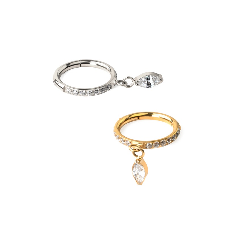 Argola articulada em titânio com pedras à frente e pendente em corte marquesa