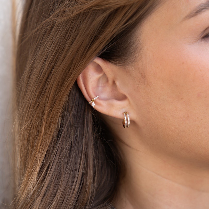 Esta linda argola contém pequenas zircónias à volta seguras com garras e uma zircónia maior em corte marquesa num pendente.