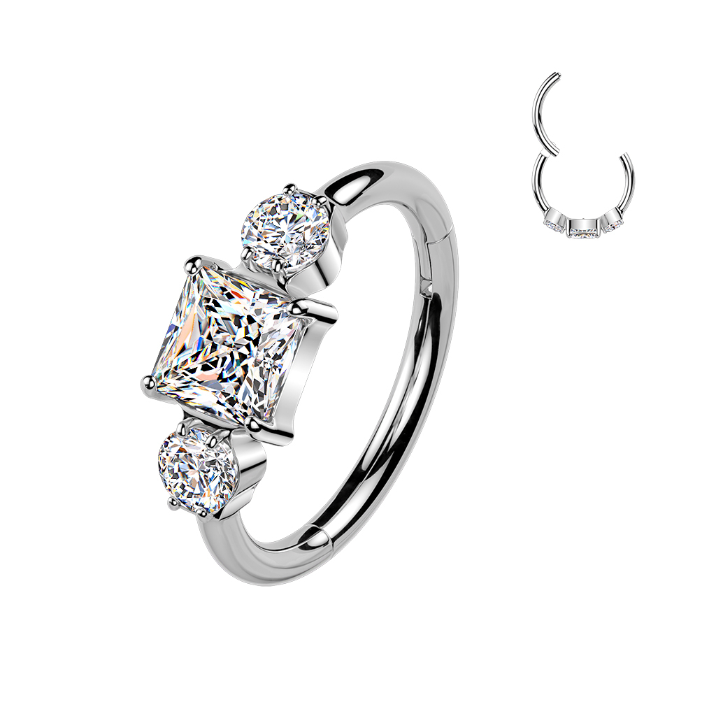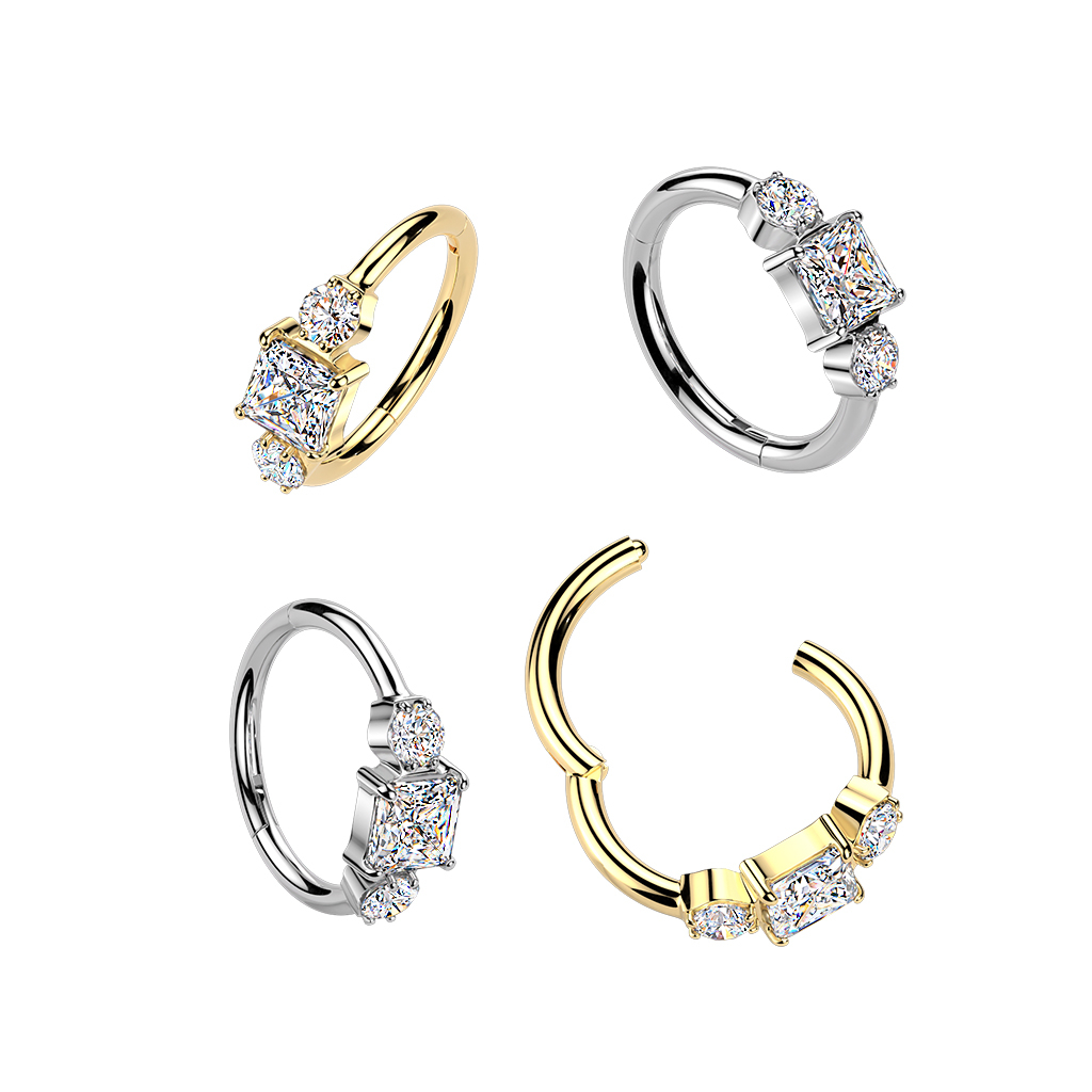 Três pedras, um flex gigante. Esta argola articulada em titânio com três zircónias dá ao teu piercing o brilho necessário. É subtil o suficiente para o quotidiano e brilhante o suficiente para atrair atenção.