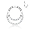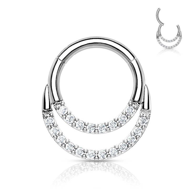 Este modelo contém um segmento articulado num dos lados. Irás perceber que a argola está fechada corretamente, quando pressionares o segmento e ouvires um clique. Para abrir a argola, basta puxar o segmento articulado. A argola está disponível em tamanhos diferentes. Escolhe o tamanho que mais se adequa à tua anatomia. Esta argola tem duas filas curvas de pequeninas pedras transparentes. Uma das filas faz parte da própria argola, enquanto que a segunda é uma fila adicional que está presa na argola. O número de pedras é proporcional ao tamanho do diâmetro que escolheres para a argola.