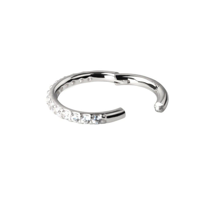 Esta argola segmentado feita em ouro maciço de 14 quilates está disponível diferentes modelos, incluindo uma elegante opção em ouro branco de 14 quilates. No lado visível da argola há um canal cheio de pequenas pedras transparentes que decoram a jóia de uma maneira muito elegante.