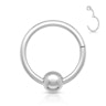 Geralmente, quando se fala em argolas de esferas, é a própria bola que é a parte do fecho e pode ser removida e reinserida. No entanto, este não é o caso. Nesta argola a bola faz parte da própria argola. A bola é presa a uma pequena barra, que é então presa ao resto da argola com uma dobradiça. Isto permite que abra facilmente a jóia segurando a barra para abrir a dobradiça. Quando quiser fechar a jóia novamente, faz a mesma coisa, exatamente o oposto. O final da argola irá encaixar-se num pequeno recesso.A argola pode ser escolhida em várias cores diferentes, como pode ver na imagem. Independentemente da escolha da cor, a argola tem um diâmetro de 8 mm, uma espessura de de barra 1,2 mm. e um tamanho de bola de 4 mm.