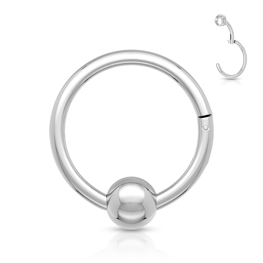 Geralmente, quando se fala em argolas de esferas, é a própria bola que é a parte do fecho e pode ser removida e reinserida. No entanto, este não é o caso. Nesta argola a bola faz parte da própria argola. A bola é presa a uma pequena barra, que é então presa ao resto da argola com uma dobradiça. Isto permite que abra facilmente a jóia segurando a barra para abrir a dobradiça. Quando quiser fechar a jóia novamente, faz a mesma coisa, exatamente o oposto. O final da argola irá encaixar-se num pequeno recesso.A argola pode ser escolhida em várias cores diferentes, como pode ver na imagem. Independentemente da escolha da cor, a argola tem um diâmetro de 8 mm, uma espessura de de barra 1,2 mm. e um tamanho de bola de 4 mm.