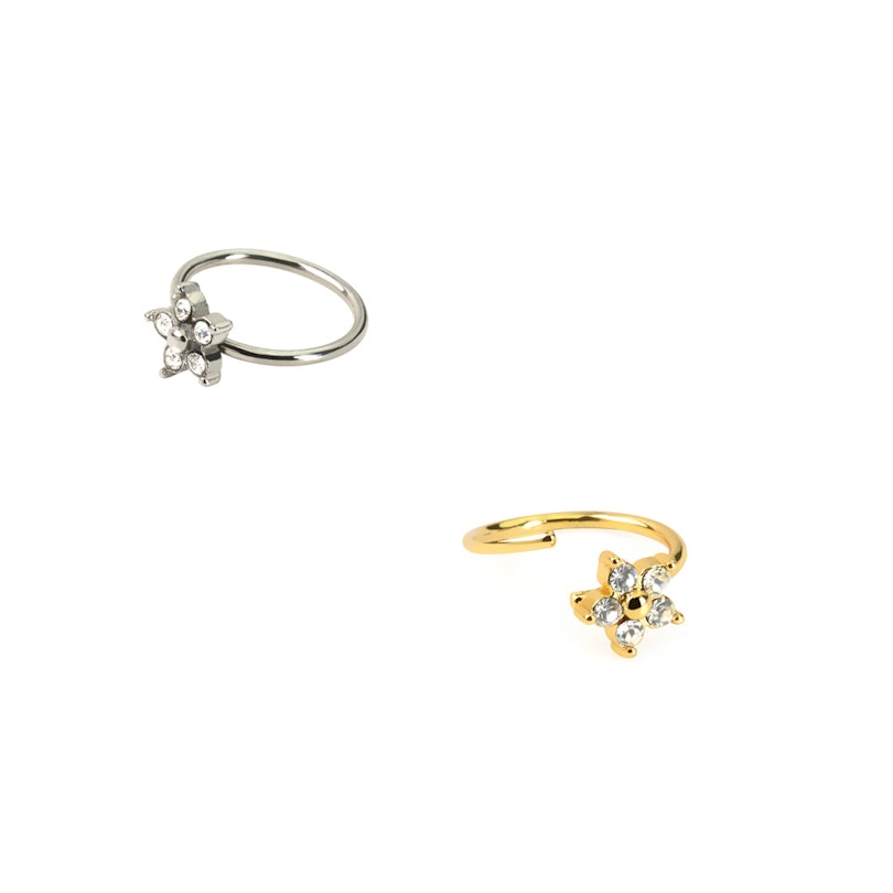 Esta argola delicada em aço cirúrgico contém uma flor delicada com cinco pétalas de pedras à volta de uma conta central. Disponível com acabamento dourado ou prateado, esta joia é feita de aço cirúrgico; portanto, é forte, resistente e não enferruja. Tem uma espessura fina (0,8 mm) e é ideal para piercings no nariz, mas também ficará muito bem no helix e em outros piercings na orelha. Para a abrires, basta torceres a joia, inserir no piercing e destorcer para fechar.