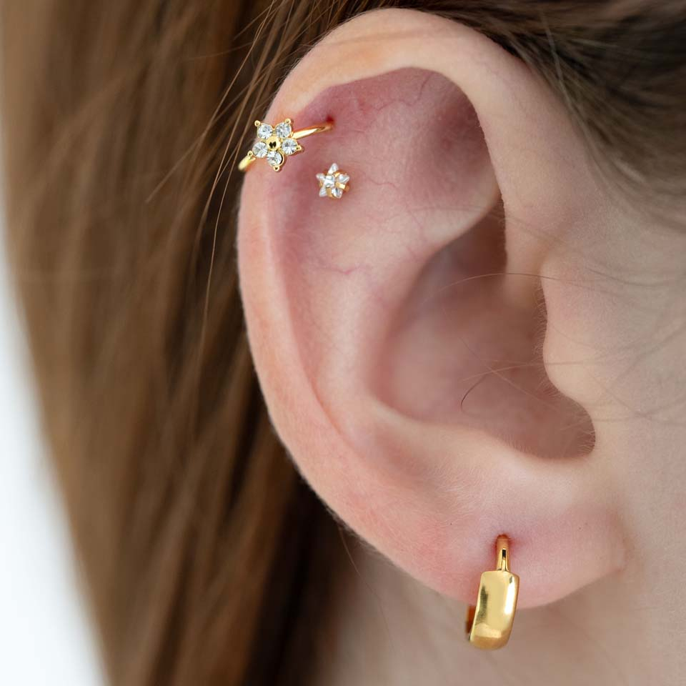 Esta argola delicada em aço cirúrgico contém uma flor delicada com cinco pétalas de pedras à volta de uma conta central. Disponível com acabamento dourado ou prateado, esta joia é feita de aço cirúrgico; portanto, é forte, resistente e não enferruja. Tem uma espessura fina (0,8 mm) e é ideal para piercings no nariz, mas também ficará muito bem no helix e em outros piercings na orelha. Para a abrires, basta torceres a joia, inserir no piercing e destorcer para fechar.