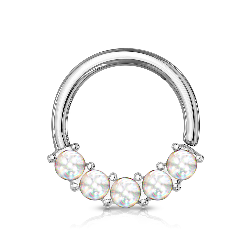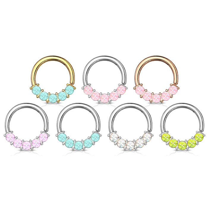A argola contínua é aberta através de torção, tornando-se muito simples de utilizar. Além disso, podes ainda escolher a cor das cinco pedras refletoras de entre várias opções.