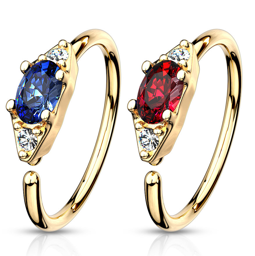 Na parte da frente da argola, há uma pequena decoração oval feita de latão, que também foi revestida a ouro de 14 quilates, para ter a mesma cor que o resto da argola. A decoração contém três pedras: duas pequenas e transparentes e uma oval e colorida, que se encontra no meio das anteriores. Poderás escolher a cor da joia do centro no menu acima. Seleciona a tua cor favorita.