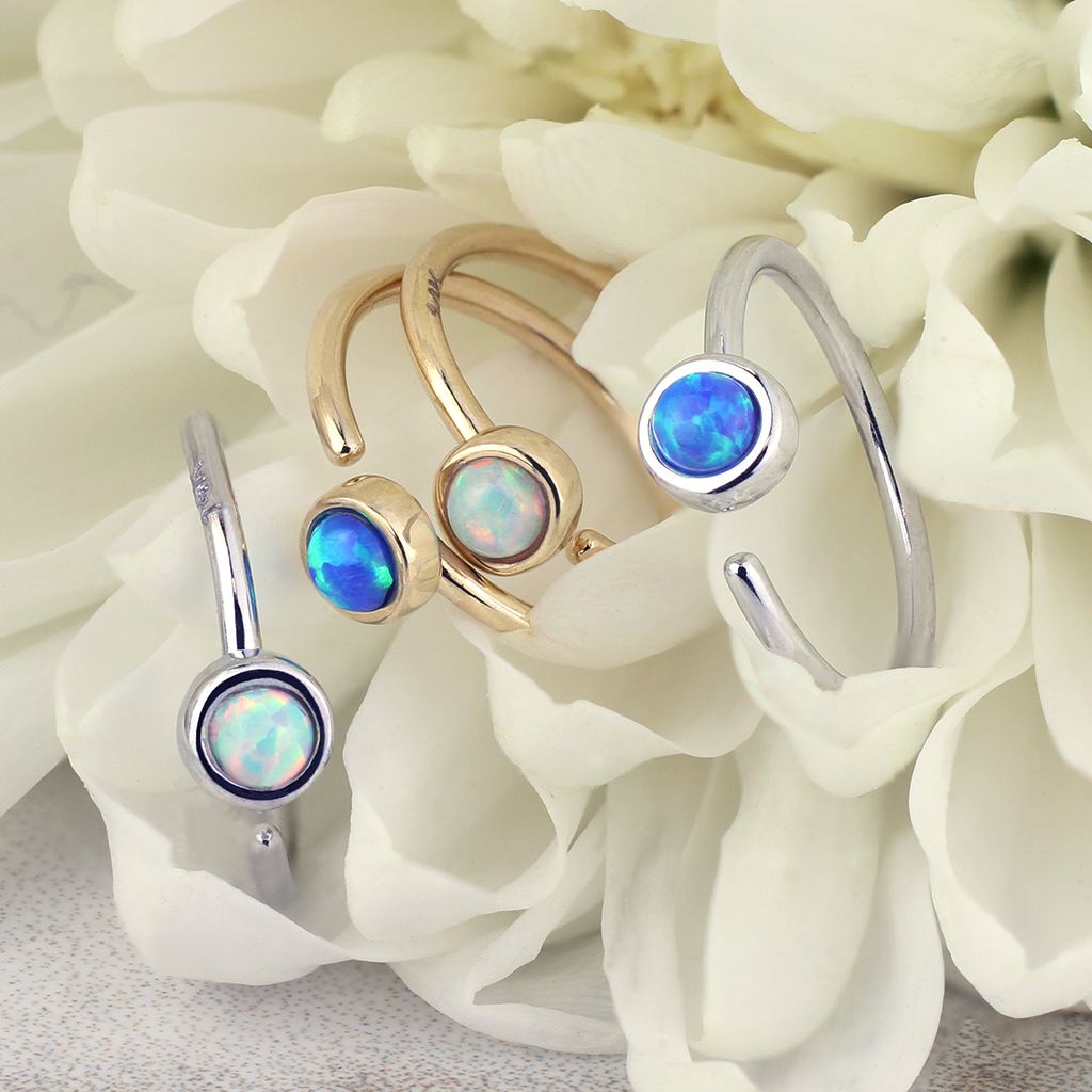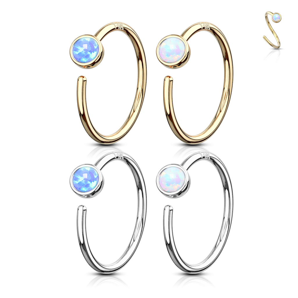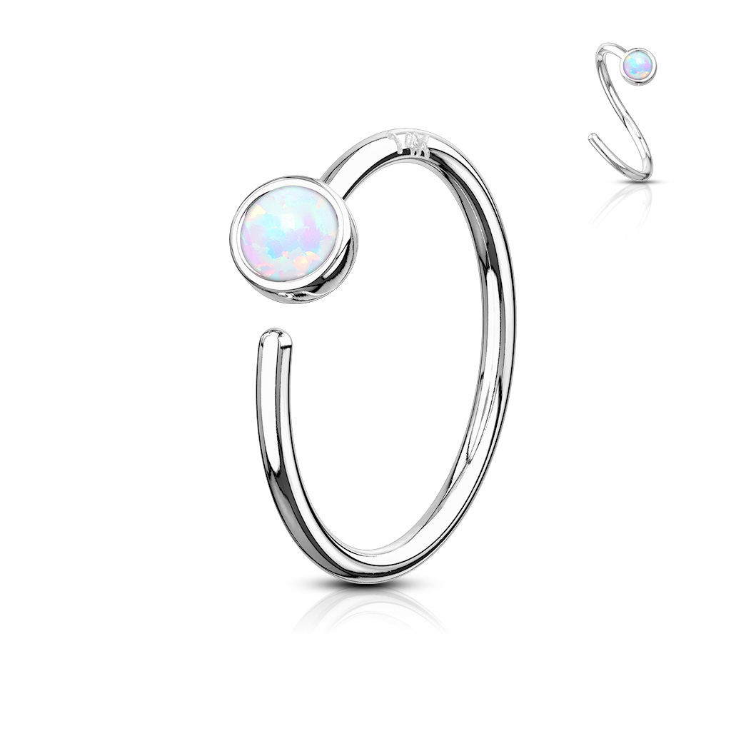 A argola está decorada com uma pequena opala de 2,5 mm. Trata-se de uma opala sintética. Além de escolher o tipo de outro desta joia, também pode escolher a cor da opala: branca ou azul. A cor branca tem tons avermelhados, amarelo e verde, mas o tom predominante é o branco. Assim é o mesmo para a opala azul, com tons azul-claro, turquesa e azul-escuro.