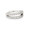 O anel que vês aqui é o que chamamos de argola contínua. Não é por não ter fim, mas sim porque o fim é difícil de encontrar, se não souberes onde procurar. Se olhares para o canto da imagem, poderás ver que a argola está torcida. É assim que se abre a joia. Abre a joia torcendo as extremidades do anel, insere-a no piercing e destorce-a, pressionando as extremidades de volta ao lugar. As joias estão disponíveis em três cores diferentes. A única diferença entre os modelos é mesmo a cor. A forma, tamanho, material e modelo são iguais, independentemente da cor que escolheres. A argola é feita de latão e revestida a platina para o obter o modelo prateado e a ouro de 14 quilates para obter os dois modelos dourados. A argola tem um peso e grossura de 16 g e 1,2 mm, respetivamente, e tem um diâmetro de 8 mm. No seu todo, pelo que conseguimos contar, cada argola tem 30 pedras.