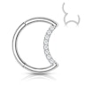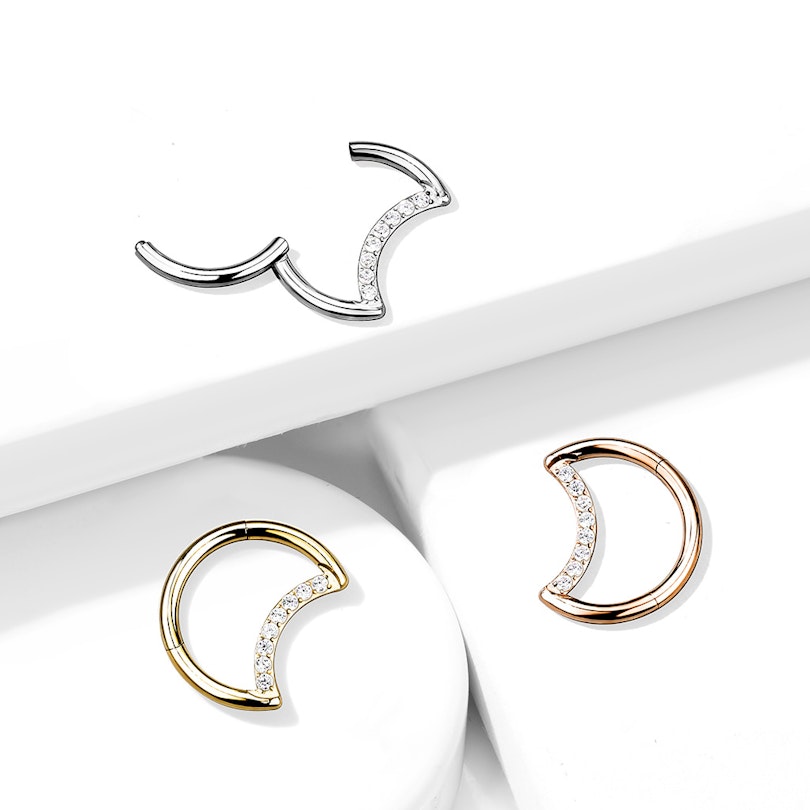 Esta argola contém detalhes de alta qualidade, porque o titânio é um material caro. Contém ainda uma articulação, que geralmente é vista em joias de grande qualidade. Além disso, as pedras que podes ver no crescente são colocadas com precisão numa linha reta. Já para não falar que de estão dispostas num arco.