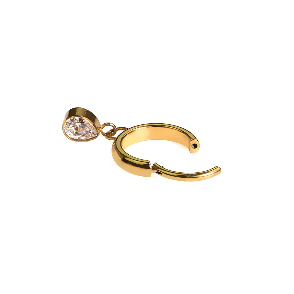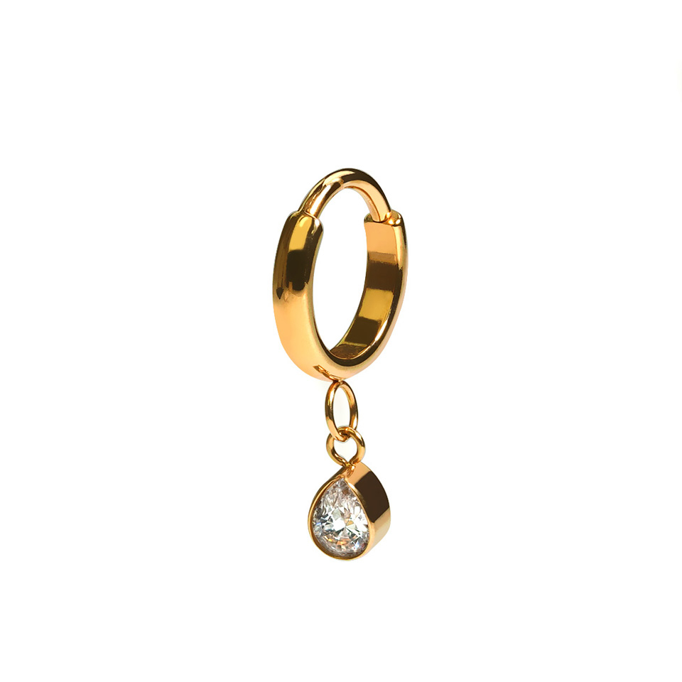 Esta argola estilosa tem uma estrutura com 2 mm de largura e uma superfície ligeiramente curva, exceto na barra que atravessa o piercing, cuja espessura podes escolher (1 mm ou 2 mm). Contém um pendente em forma de gota, com uma zircónia cúbica embutida, que está seguro à argola com duas argolinhas mais pequenas. A gota tem 4,5 mm.