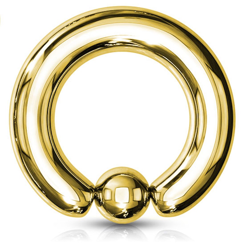 Aqui tem uma estupenda argola, feita em aço cirúrgico maciço e banhada a ouro. Por trata-se de uma joia com um fecho muito duro, recomendamos-lhe que use um alicate de argolas quando quiser colocar esta joia no seu corpo. Todos os modelos têm um diâmetro de 13 mm, mas pode escolher a grossura da barra que quiser.