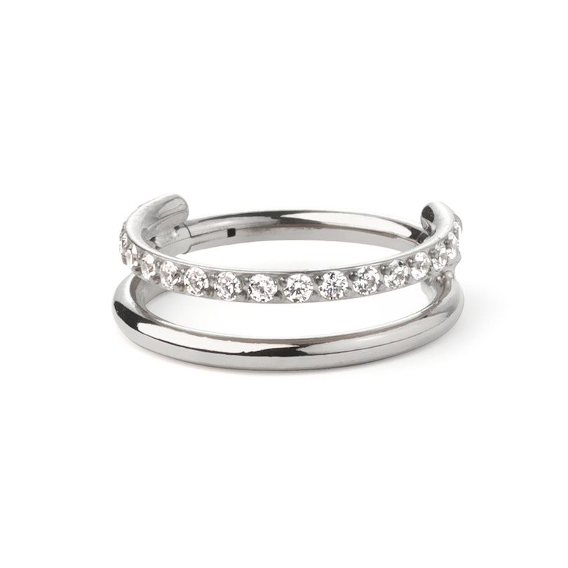 Esta joia especial tem duas argolas: uma delas tem uma fileira de pedras e a outra não tem nada. Ambas as argolas estão ligadas por uma barra e são muito resistentes. É feita de titânio, antialérgica e muito resistente. Está disponível com diferentes diâmetros e com acabamento em dourado ou prateado. Esta linda argola é perfeita para vários piercings na orelha e será uma excelente adição à tua seleção de piercings na orelha, independentemente do sítio onde a quiseres colocar.