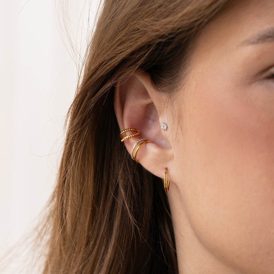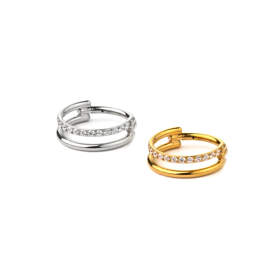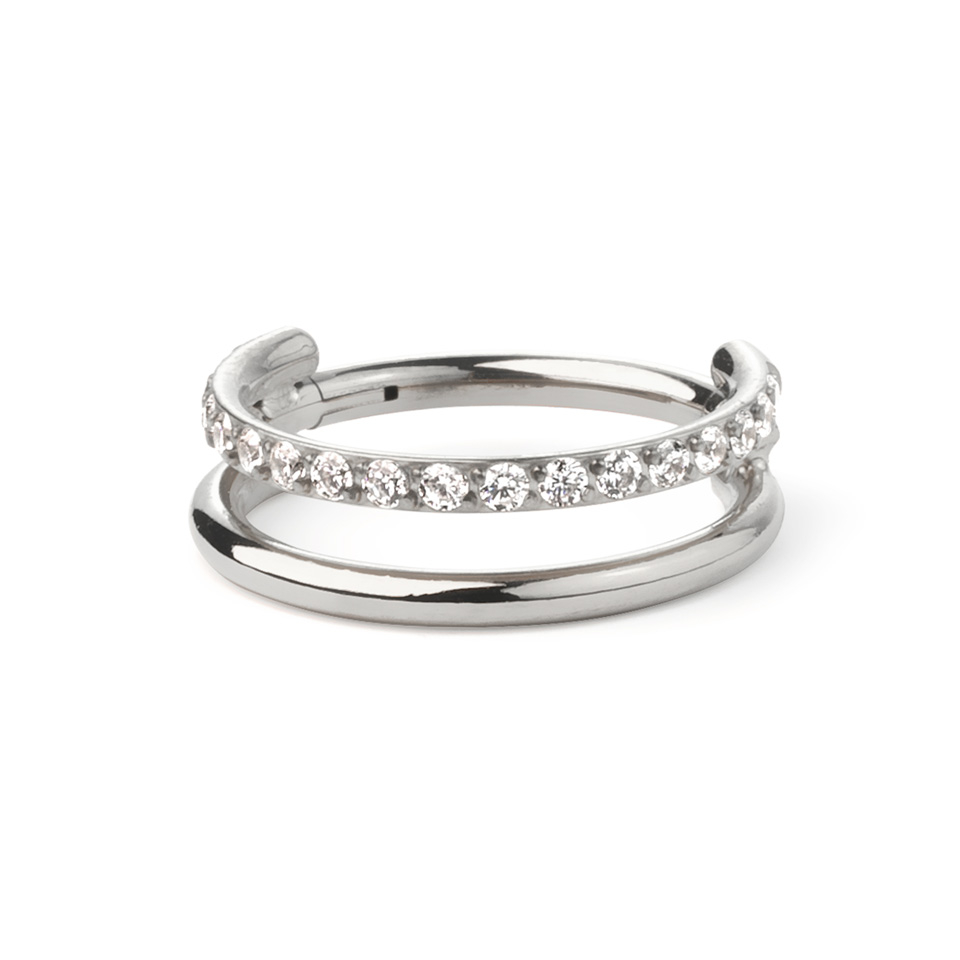 Esta joia especial tem duas argolas: uma delas tem uma fileira de pedras e a outra não tem nada. Ambas as argolas estão ligadas por uma barra e são muito resistentes. É feita de titânio, antialérgica e muito resistente. Está disponível com diferentes diâmetros e com acabamento em dourado ou prateado. Esta linda argola é perfeita para vários piercings na orelha e será uma excelente adição à tua seleção de piercings na orelha, independentemente do sítio onde a quiseres colocar.