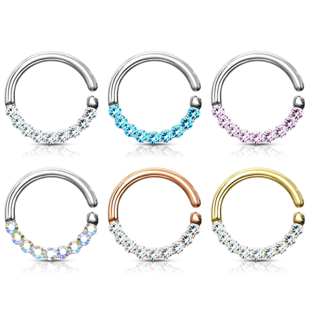 O tipo de joia que vês na imagem acima tanto pode ser utilizado no nariz com em vários outros piercings, desde que a espessura da argola assente na tua perfuração. Estas opções são possíveis porque a argola é contínua, contendo apenas uma pequena abertura lateral, ou seja, não tem sistema de fecho. Para a abrires, basta torceres o material. Evita puxar as pontas em direções opostas, verticalmente, para não danificares a joia. A argola é feita de latão e tem diferentes revestimento. O modelo prateado é revestido a platina; porém, os modelos em ouro rosa e amarelo são revestidos a ouro de 14 quilates.