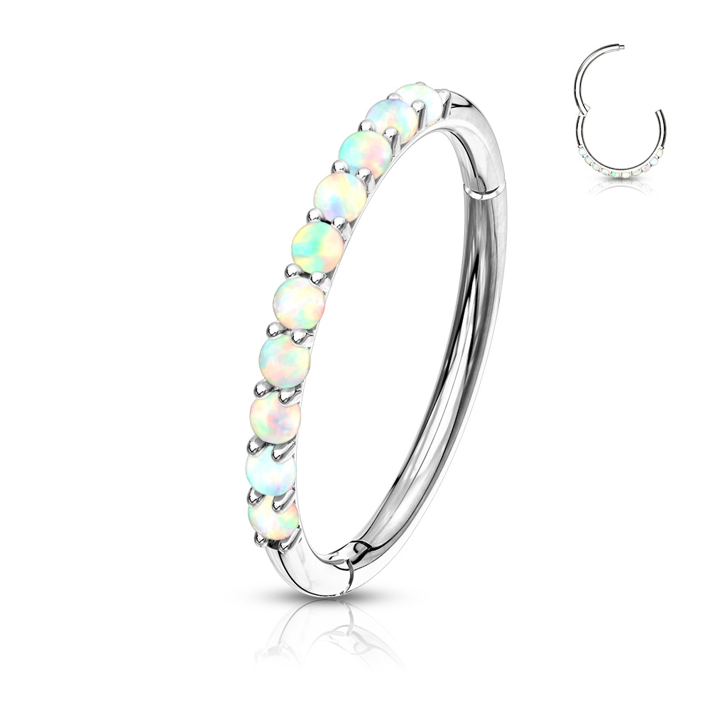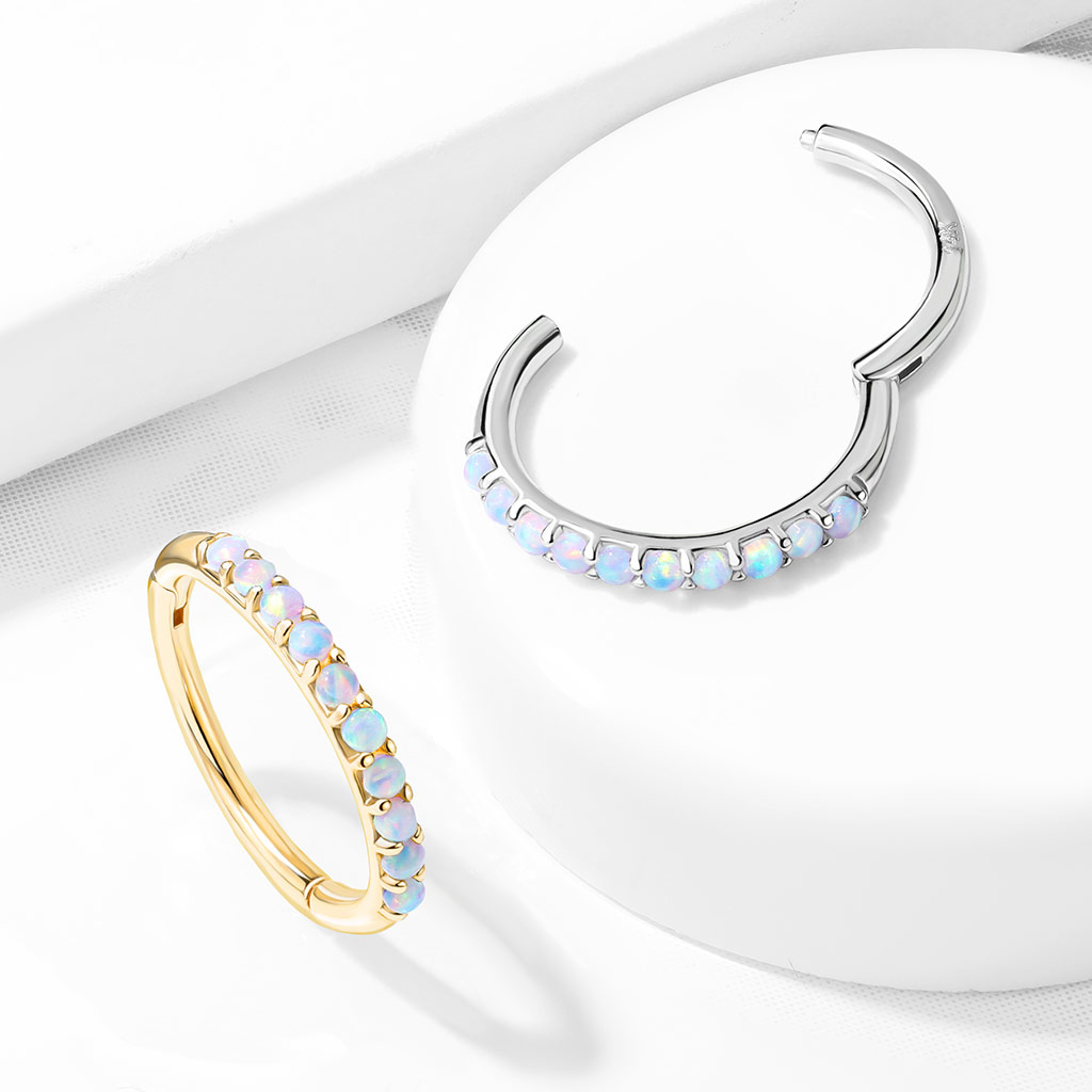 A argola que vê acima é o chamado de argola sem fim. Parece que não tem fim, mas isto não é inteiramente verdade, porque, caso contrário, seria difícil colocá-la. Isto significa que, quando a argola está fechada, os fins não são fáceis de encontrar devido à forma como se fecha. Uma pequena parte da argola pode ser aberta, o que também pode ver na figura acima. Essa parte é presa à restante argola com uma dobradiça, para poder inclinar para cima e para baixo. Para abrir e fechar a argola, puxe suavemente a extremidade oposta da dobradiça enquanto o segura. Dessa forma, a pequena maçaneta que fica no final da barra sai do final da argola. Pode ser necessário testar algumas vezes até que o jeito. A argola é feito de ouro de 14 quilates - aqui escolhe se deve ser em ouro amarelo comum ou se deseja optar pelo ouro branco. Ambas as variantes contêm igualmente a mesma quantidade de ouro. Ao mesmo tempo, deve também decidir sobre o diâmetro da argola, o que obviamente deve se encaixar na medida que utiliza agora. A argola tem um bom desempenho em ambos os piercings de orelha e nariz. Talvez não no septo, pois as opalas apontam para baixo. Aliás, as opalas não são opalas reais, pois são muito frágeis para uso em jóias. Em vez disso, foram usadas opalas sintéticas, que são muito mais resistentes - aqui apenas um especialista poderá ver a diferença. A espessura da rosca da argola é de 1,2 mm.