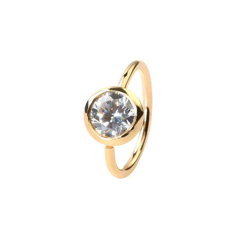 Apresentamos-lhe uma argola simples e original feita em ouro de 14 quilates, para si, que gosta de joias de boa qualidade. Esta argola tem uma grossura de barra de 0,8 mm e com diâmetro de 8 mm. A sua bola está decorada com um brilhante transparente, que fica preso por meia bola côncava, unida à estrutura da joia. A bola ajusta-se à extremidade da argola para puder fechar, pelo que não tem de ter medo de a perder. Apenas tem de abrir a sua argola com um pequeno giro e introduzir na sua perfuração, para depois ajustar a extremidade na bola. É tão simples como rápido.