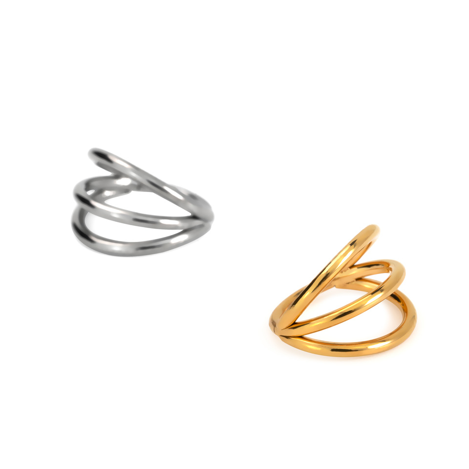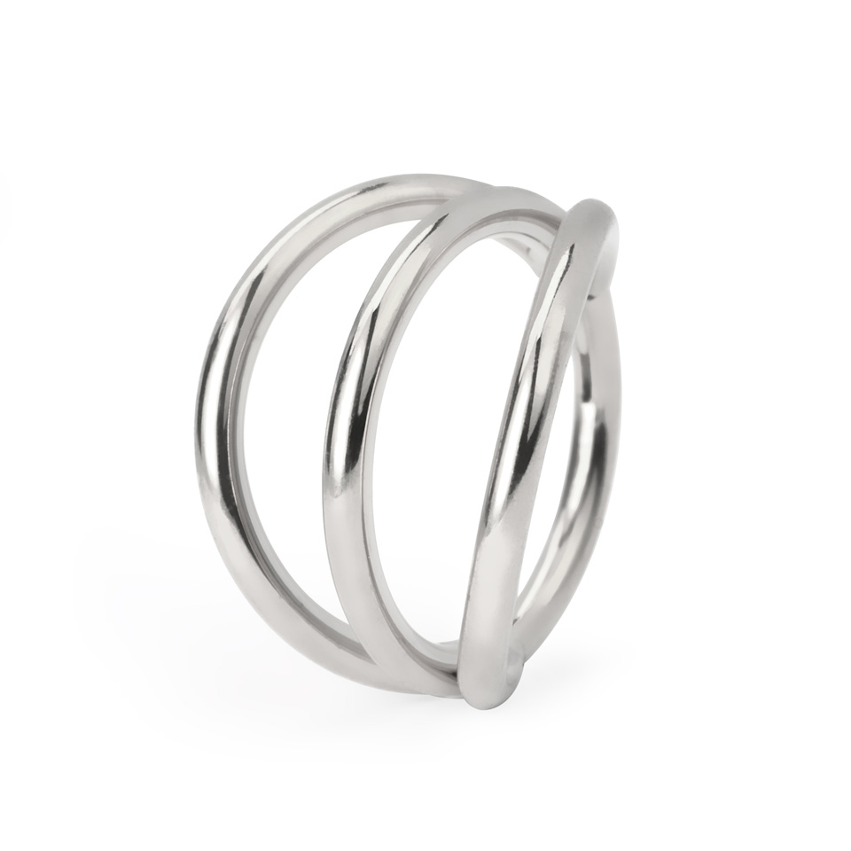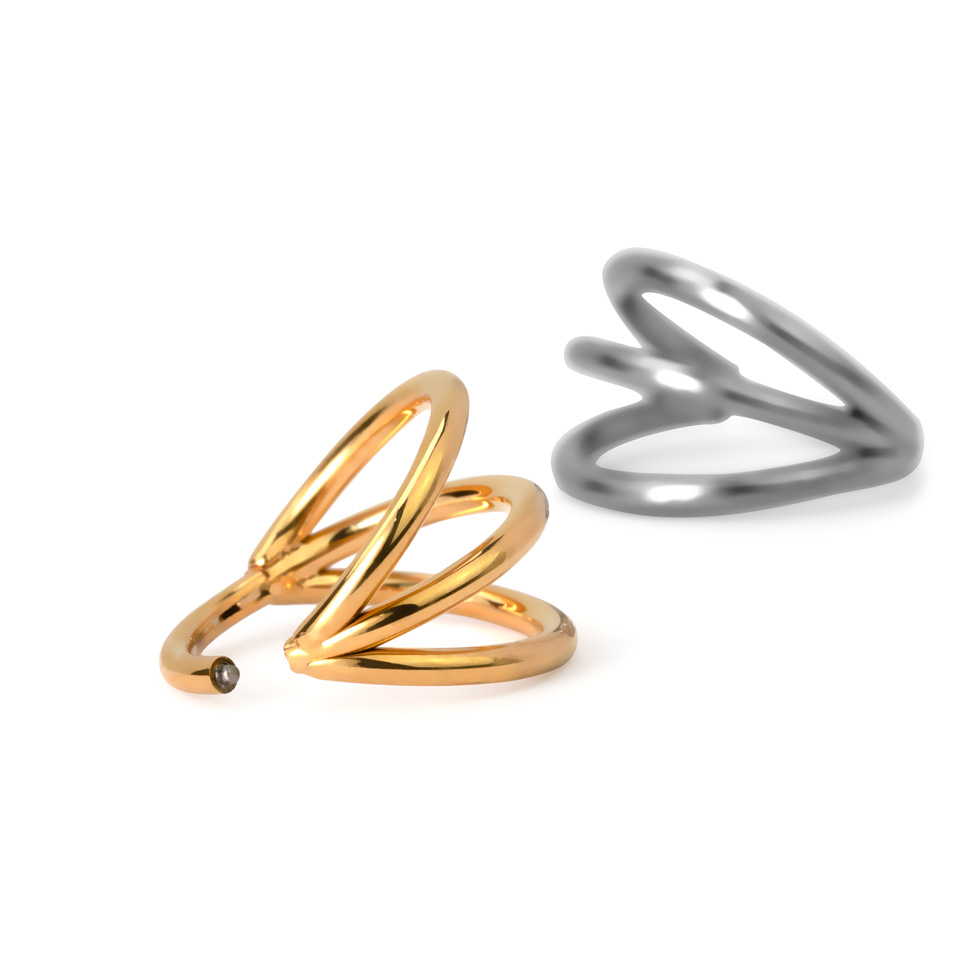 Esta argola simples mas eficaz tem três argolas separadas que se juntam numa barra comum para entrar no teu piercing.