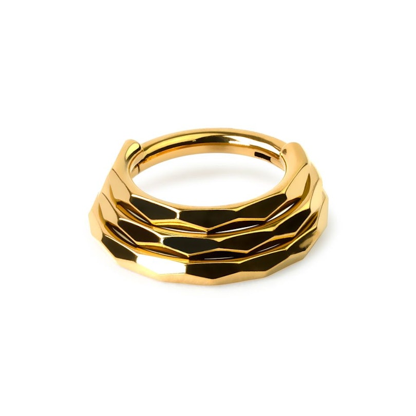 Esta estilosa argola articulada tem 3 argolas numa, mas só a do meio é colocada no teu piercing. A parte externa das argolas tem um padrão ao estilo de um diamante, dando uma textura bem fixe à joia.