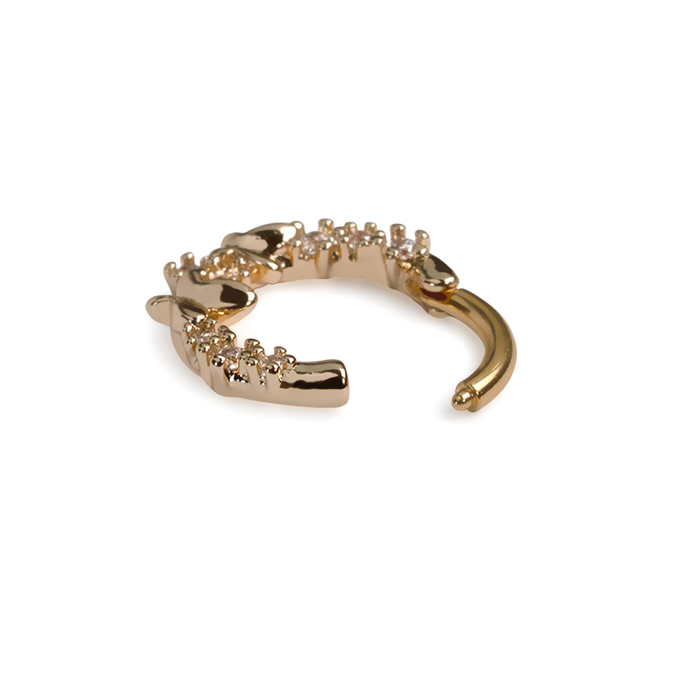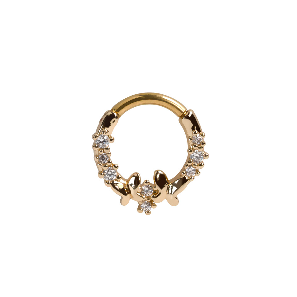 Esta argola virada para a frente com borboletas super fofinha contém duas borboletas rodeadas de zircónias. É uma joia com fecho articulado, por isso, torna-se mais fácil de fixar no piercing.