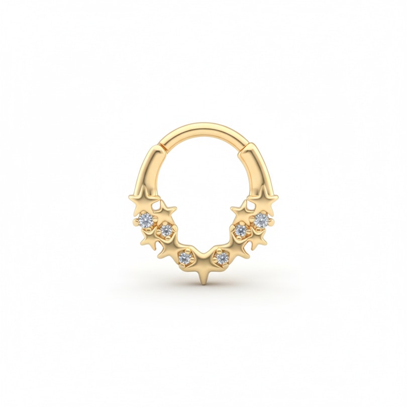 Esta argola virada para a frente com estrelas e luas será um grande complemento à tua coleção. A sua abertura articulada facilita a introdução e a fixação ao piercing.
