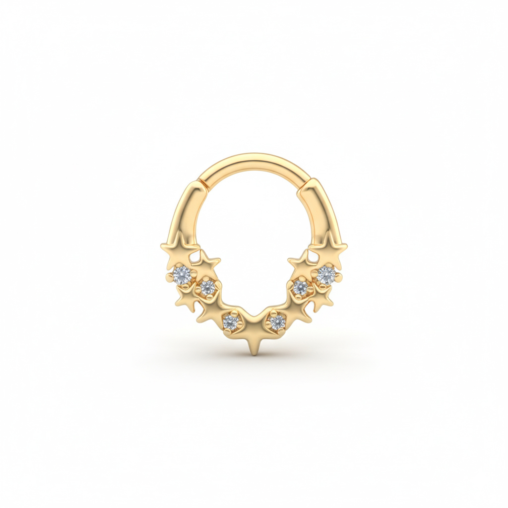 Esta argola virada para a frente com estrelas e luas será um grande complemento à tua coleção. A sua abertura articulada facilita a introdução e a fixação ao piercing.