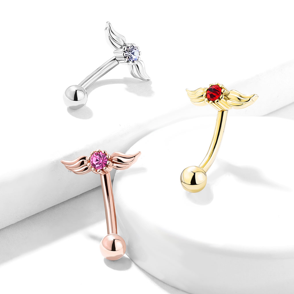 A joia que podes ver na imagem é um barbell curvo que foi especialmente concebido para um piercing na sobrancelha. A barra tem 8 mm de comprimento e 1,2 mm de espessura. A bola existente na parte inferior da barra tem 3 mm e tem rosca. No topo da joia não está uma bola, como normal, mas sim um par de asas. No meio das asas há uma bela pedra que terá uma cor diferente, consoante a cor que escolheres para o barbell.