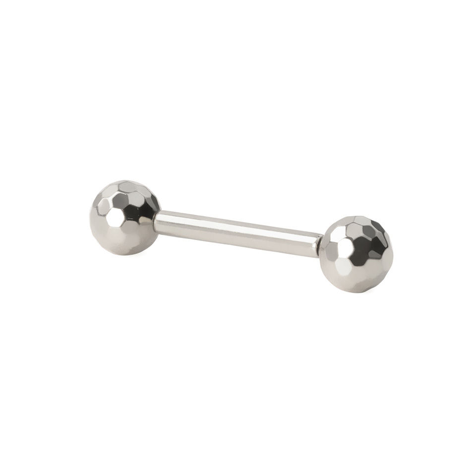 Este barbell em titânio contém uma bola com várias faces em cada ponta que lhes dá o aspeto de bolas de espelhos. Esta joia não contém rosca, ou seja, é de encaixe, e isso significa que é simples de inserir, porque basta empurrar as bolas na barra, para as segurar. Desta forma, as pontas duras ou os fechos complicados ficam fora do cenário.