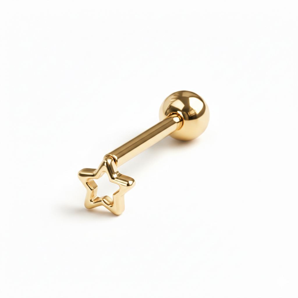 Este barbell em titânio para a língua com uma estrela é hipoalergénica; portanto, é indicada para quem tem a pele sensível. Contém rosca interna; portanto, basta inserires a barra no piercing a apertar.