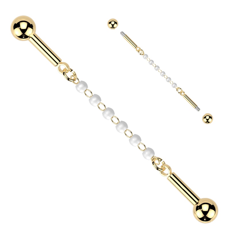 Este barbell industrial com corrente de pérolas traz um toque mais suave ao industrial. Uma linha de pequenas contas tipo pérola corre de ponta a ponta, ligadas por elos de corrente finos, que dão um ar mais elaborado ao barbell. Esta joia, disponível em dourado e prateado, vai ser a escolha imediata para quando queres algo diferente do barbell reto do costume.