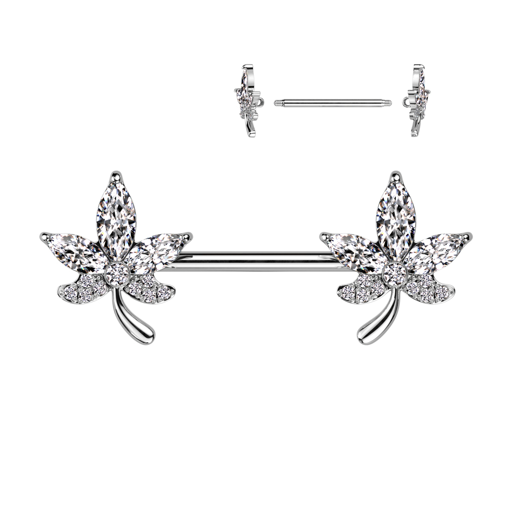 Esta joia é um barbell para o mamilo cheio de luz com folhas cobertas com pedras brilhantes.