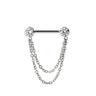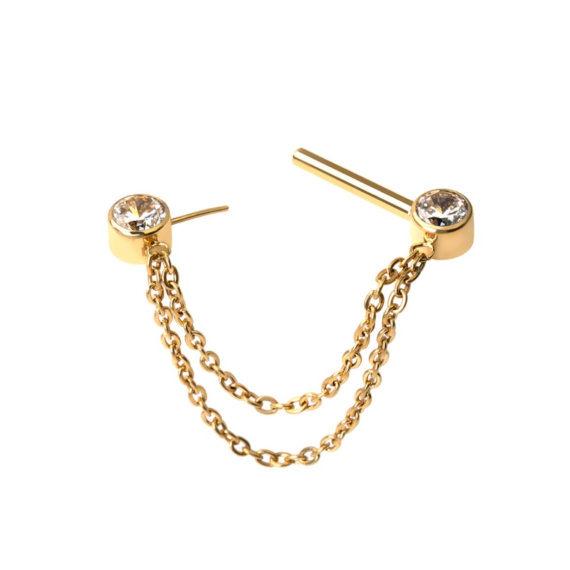 Este barbell para o mamilo é feito de titânio grau de implante e tem umas bolinhas com zircónias cúbicas embutidas. Esta joia única contém ainda duas correntes em titânio que ficam penduradas por baixo do mamilo. Estão ligadas por uma argolinha delicada.
