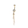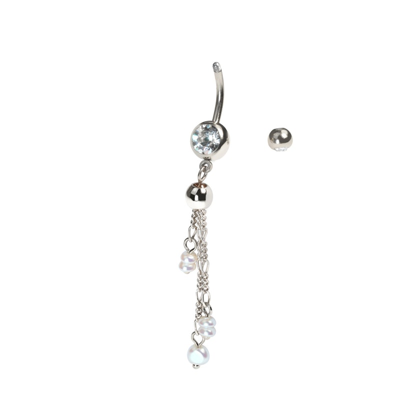 Este barbell para o umbigo com correntes e pérolas contém zircónias em ambas as bolas. Presas à bola do fundo estão correntes delicadas com pérolas sintéticas de diferentes tamanhos.