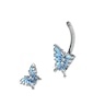 Este barbell para o umbigo não tem uma, mas sim duas borboletas adoráveis: uma bem linda e grande no fundo e uma gémea mais pequenina no topo. Ambas contêm pequenas pedras brilhantes nas asas e no corpo.