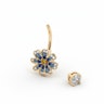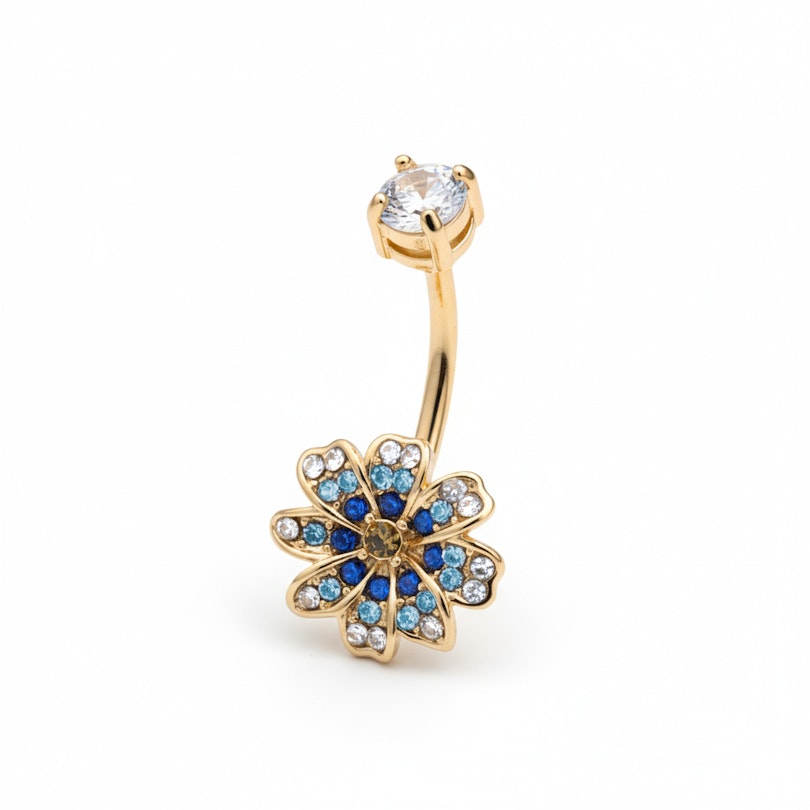 Este barbell fofinho para o umbigo com flor azul foi feito para a época dos tops. Contém uma flor feita de pequenas pedrinhas em diferentes tonalidades de azul com um pedra amarela no centro. No topo encontra-se uma pedra transparente.