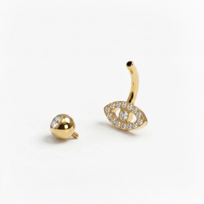 Este barbell para o umbigo em titânio anti-mau-olhado dá um toque simbólico ao teu look. O olho grego ao centro contém pequenas pedras à volta que realçam a sua forma. É discreto, mas expressivo, fácil de usar e funciona bem tanto em dias descontraídos como quando queres um look mais cuidado. Disponível em dourado e prateado.