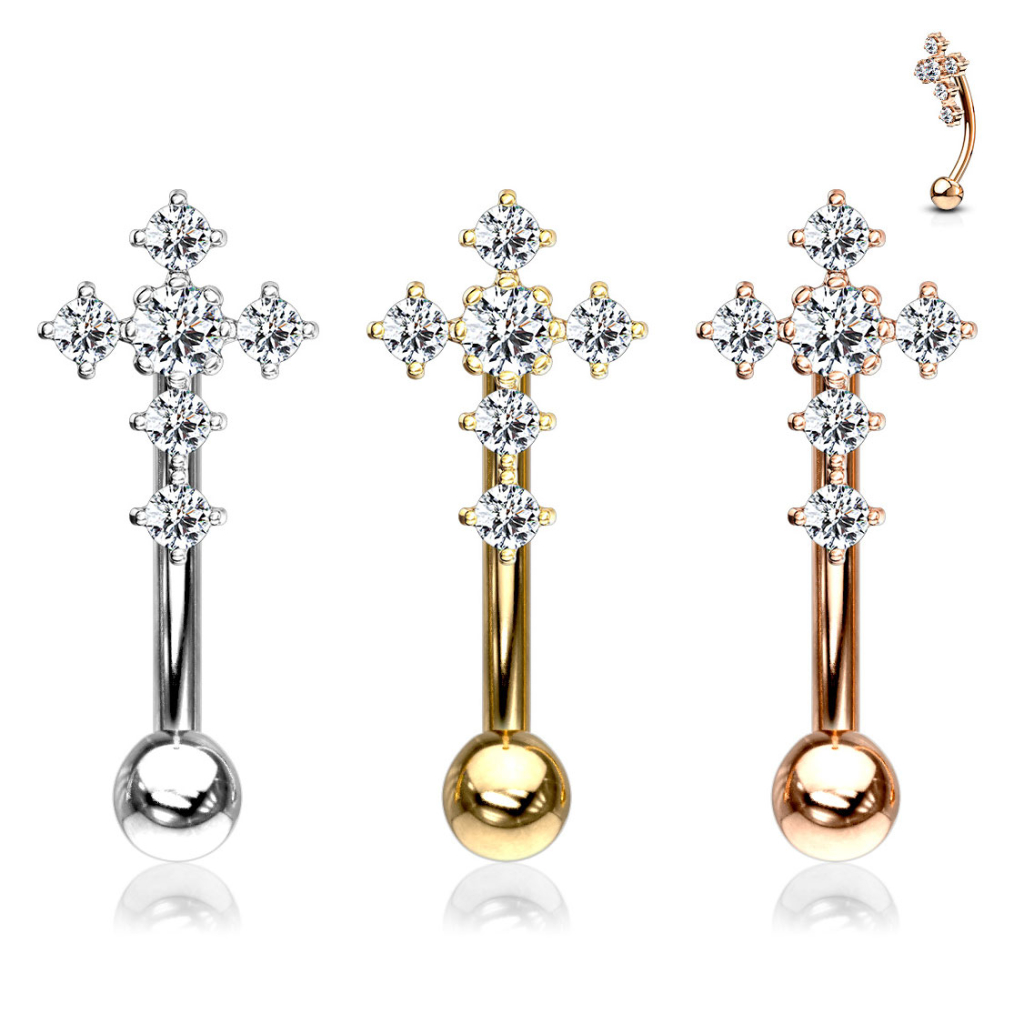 Esta haste curva é feita de aço cirúrgico e pode escolher entre três lindas cores de materiais. As cores usadas vêem do ródio para o branco e o ouro de 14 quilates. As pedras formam uma linda cruz. Há uma pedra no topo, uma de lado, e uma ligeiramente maior no centro. Todas as peças são redondas e mantidas no lugar graças a pequenos braços de fixação.