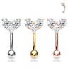A barra é ligeiramente curta e tem um fundo de 3 mm como bola superior. No topo tem três pequenas pedras fixadas por meio de braços de latão, que juntos formam um coração. Duas das pedras são redondas e a terceira é quadrada. Com um pouco de boa imaginação, podes realmente parecer o rosto de um pássaro com as duas pedras redondas como olhos e a pedra quadrada como um bico.
