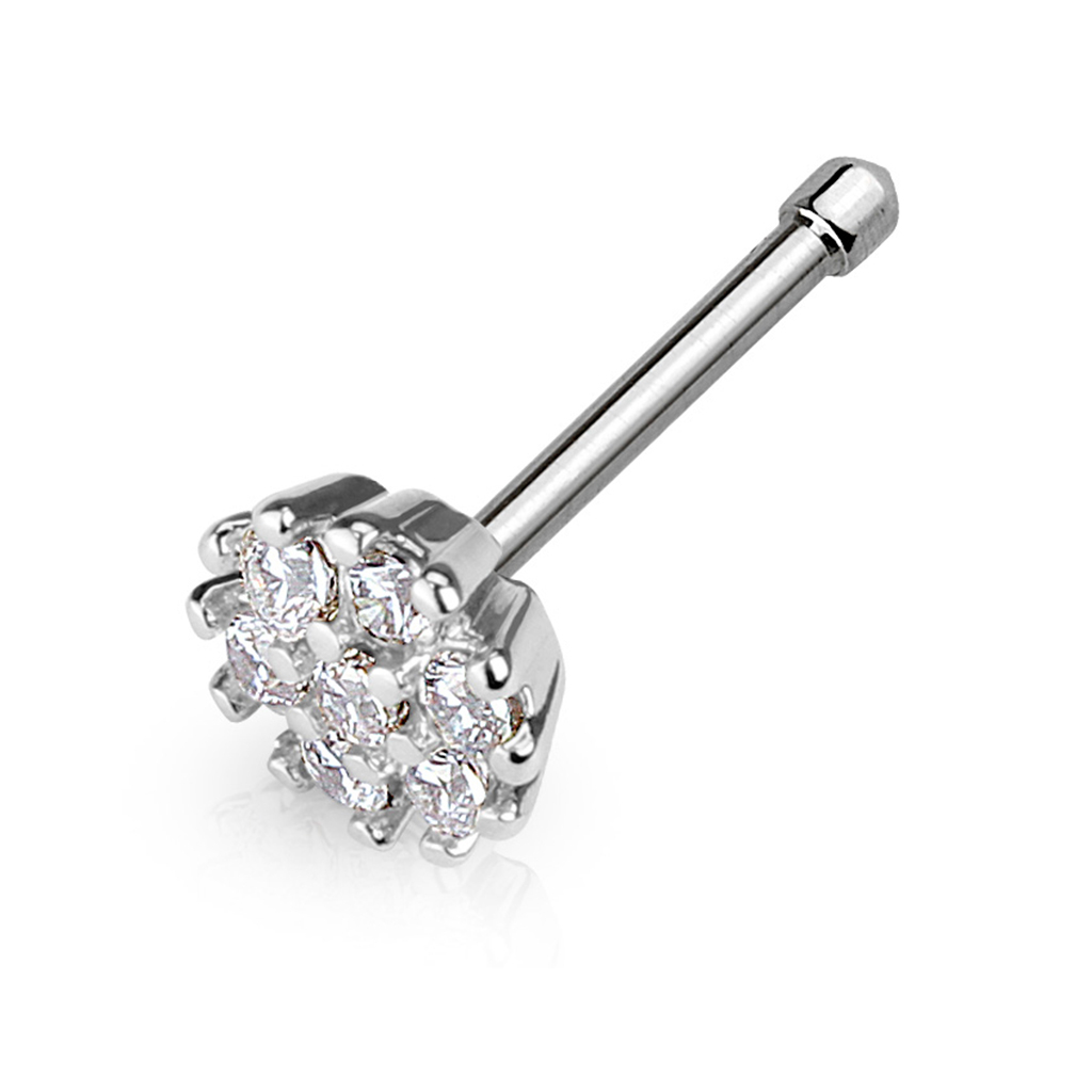 Esta barra de nariz é para si que procura um visual feminino, mas ao mesmo tempo não quer algo que quase não se vê. Esta joia é um pouco maior que outras joias e mede um total de 6 mm. de diâmetro. Esta é preenchida com pequenas pedrinhas brilhantes que juntas representam uma flor. No entanto, pode ser difícil ver as pedras separadamente uma das outras, uma vez que os seus brilhantes reflexos fazem com que as pedras cristalinas misturem-se com as outras. Mas é exactamente isso que torna a joia feminina.
